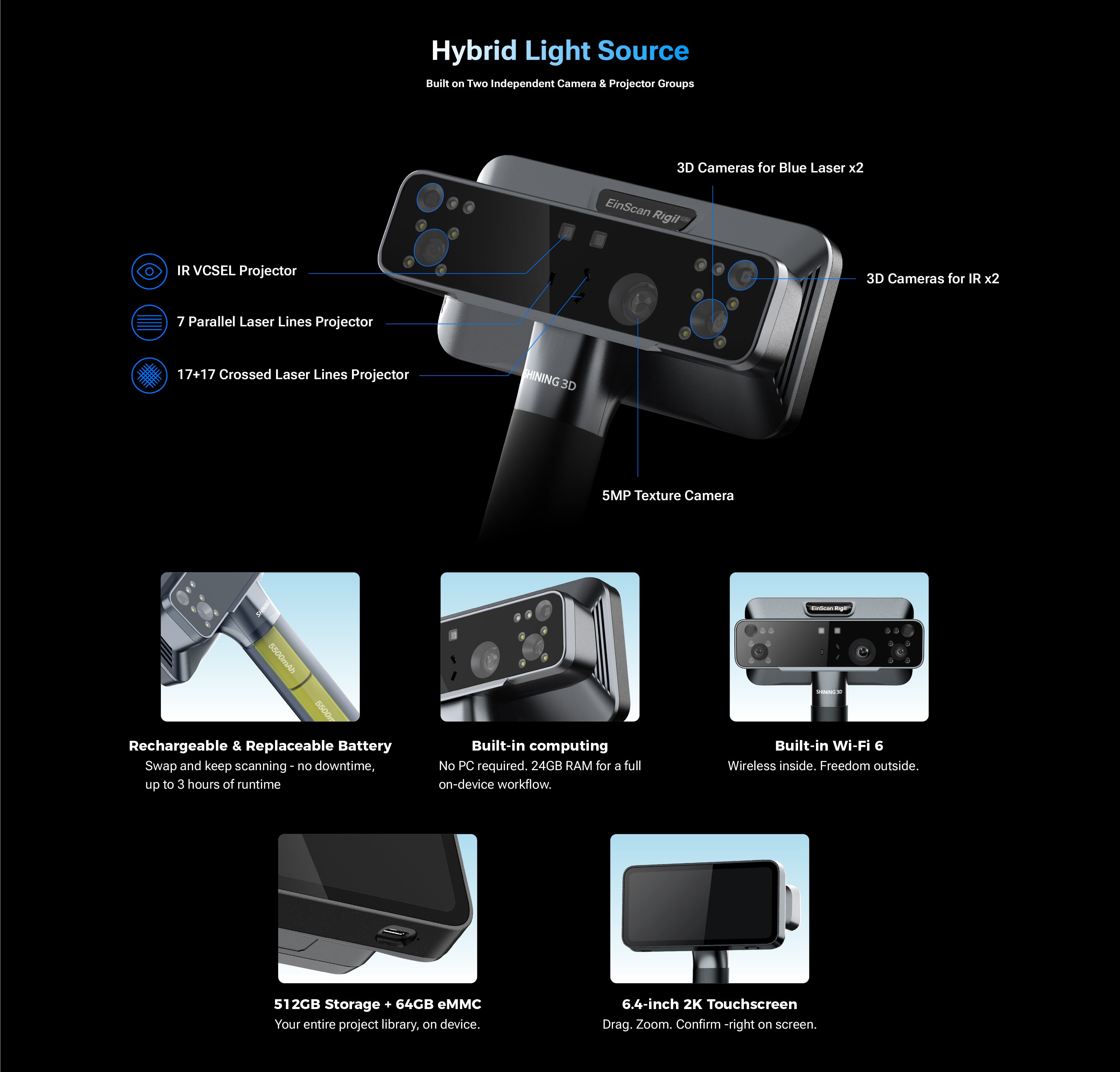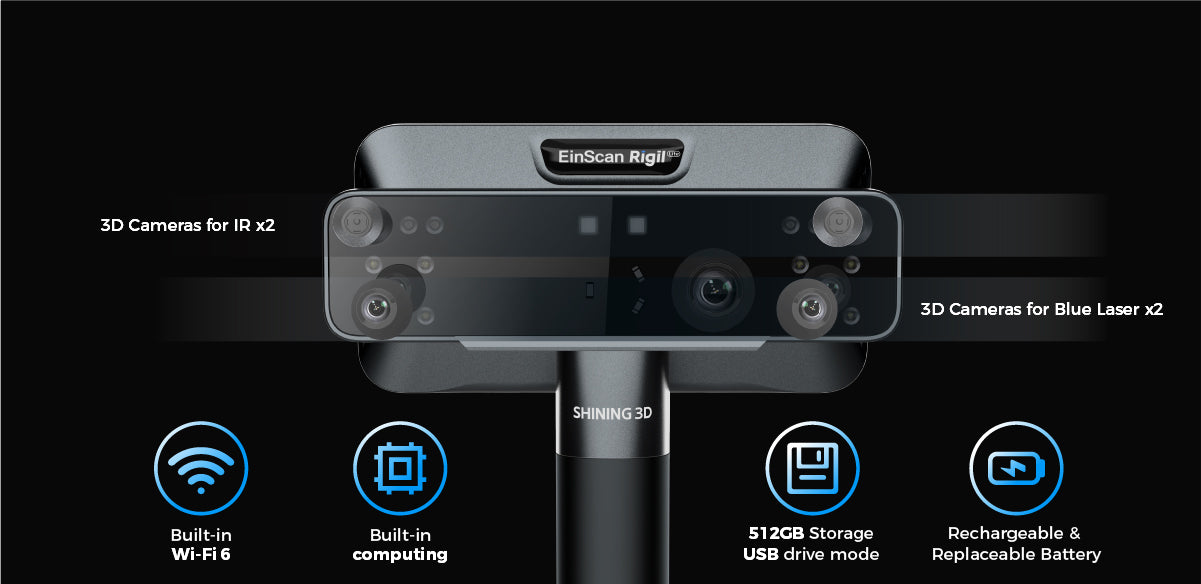 The EinScan Rigil Series represents the complete form of all-in-one 3D scanners, integrating hardware components such as the scanner, display, computing, storage, and power supply into a unified design, with the entire workflow independently accomplished on-device through software.