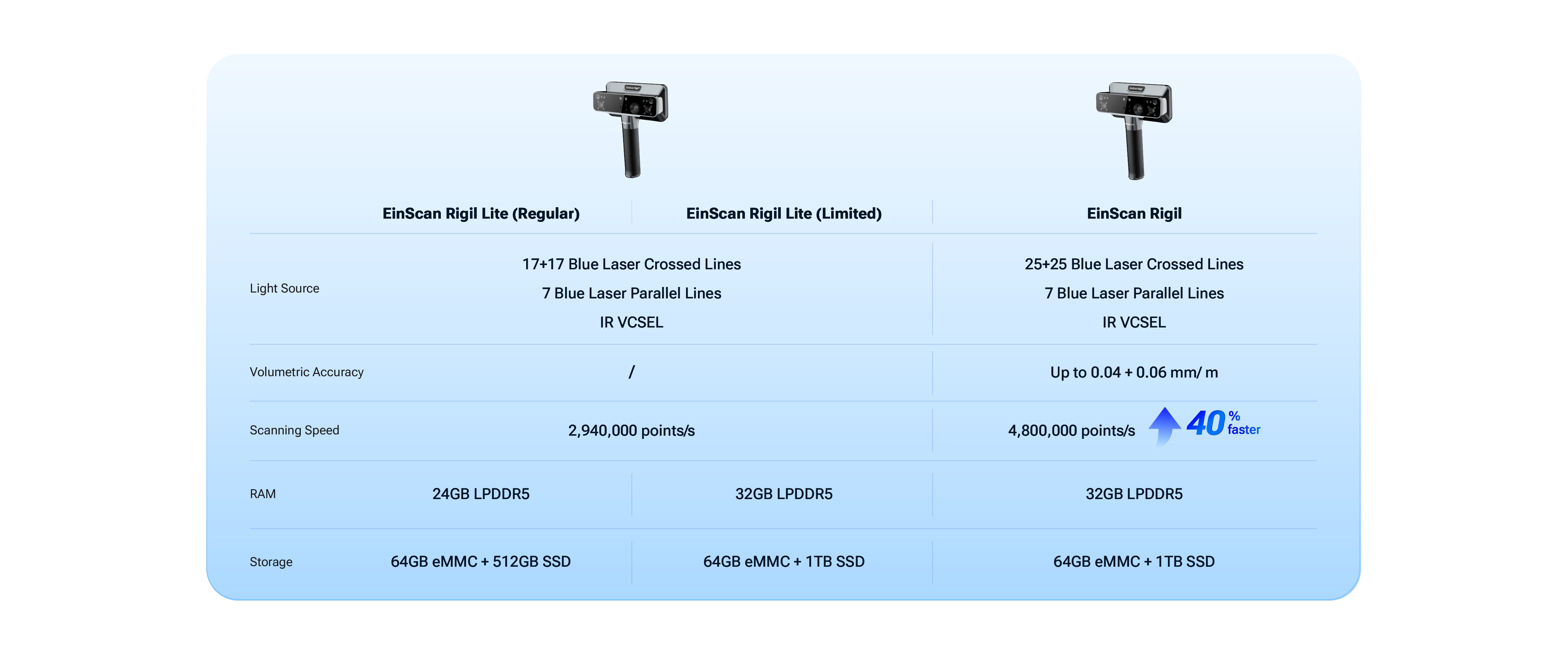 - Accuracy: Rigil has 0.04+0.06mm volumetric accuracy which is confirmed of each device, Rigil Lite accuracy is a bit lower.