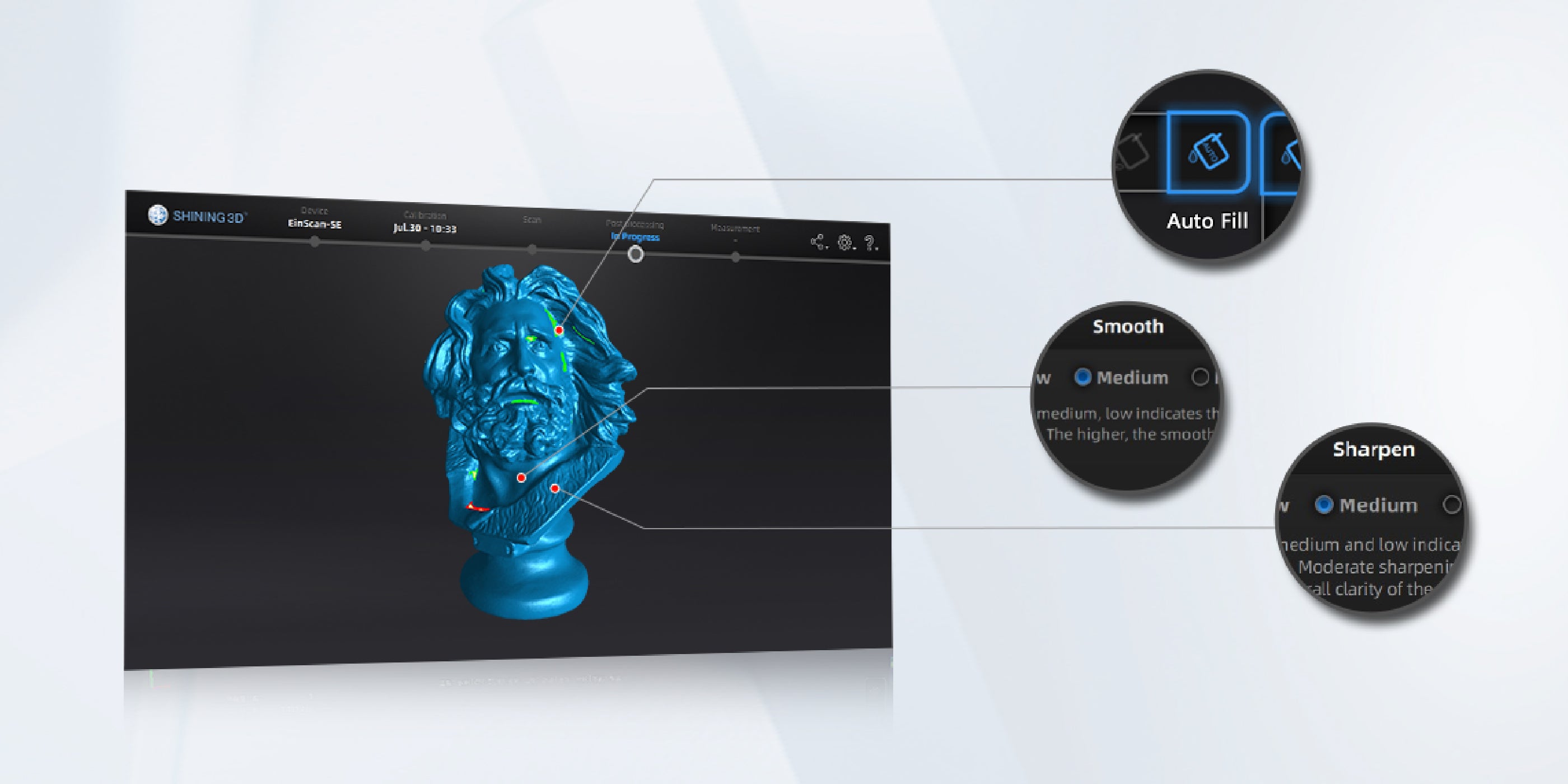 EinScan-SE/SP V2 のソフトウェアには、穴埋め、スムージング、シャープニングの機能があり、後処理プロセスでデータ座標を再調整して、後続のアプリケーションにより完璧な 3D データを提供することもできます。