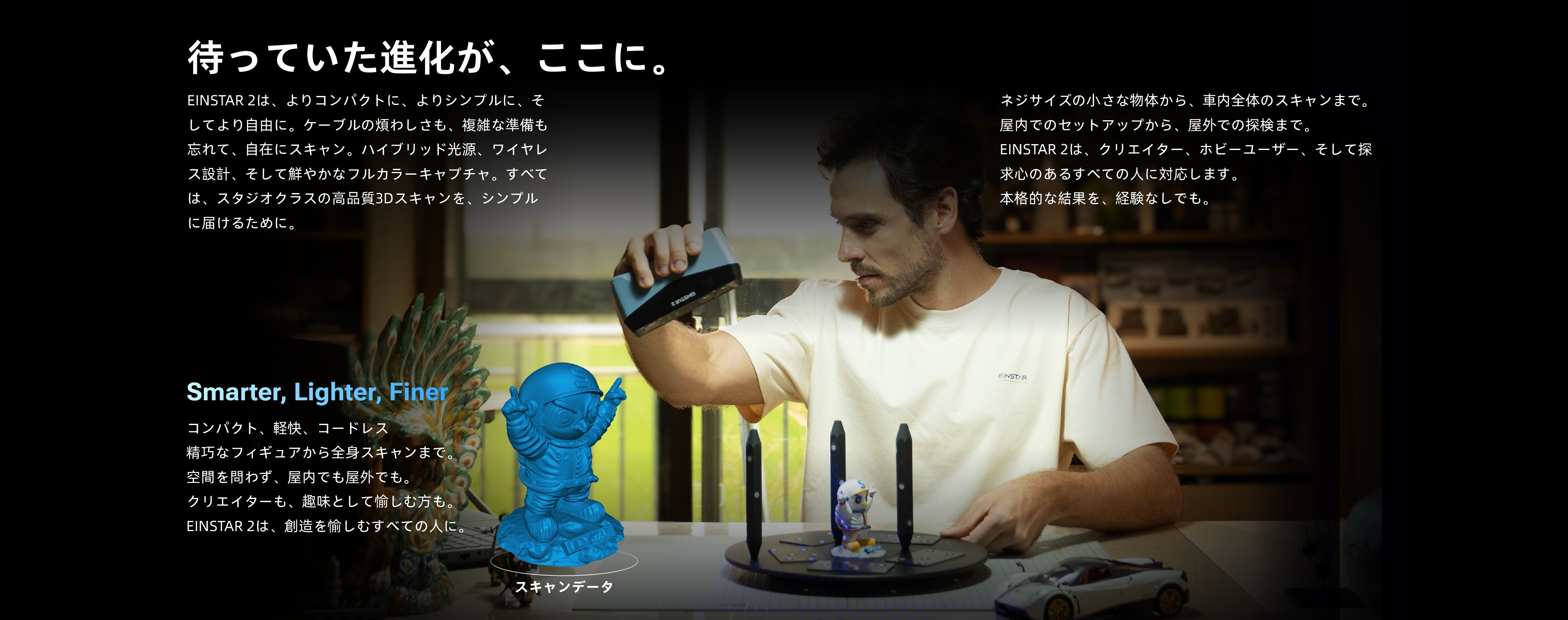 The EINSTAR 2 is a major step up from the original. It introduces a new laser mode for capturing finer details on small objects and can handle reflective surfaces without spray. The tracking in IR mode is even better, and the true wireless design offers greater flexibility. Furthermore, the new software delivers dramatically faster processing speeds and many other refined features to explore.