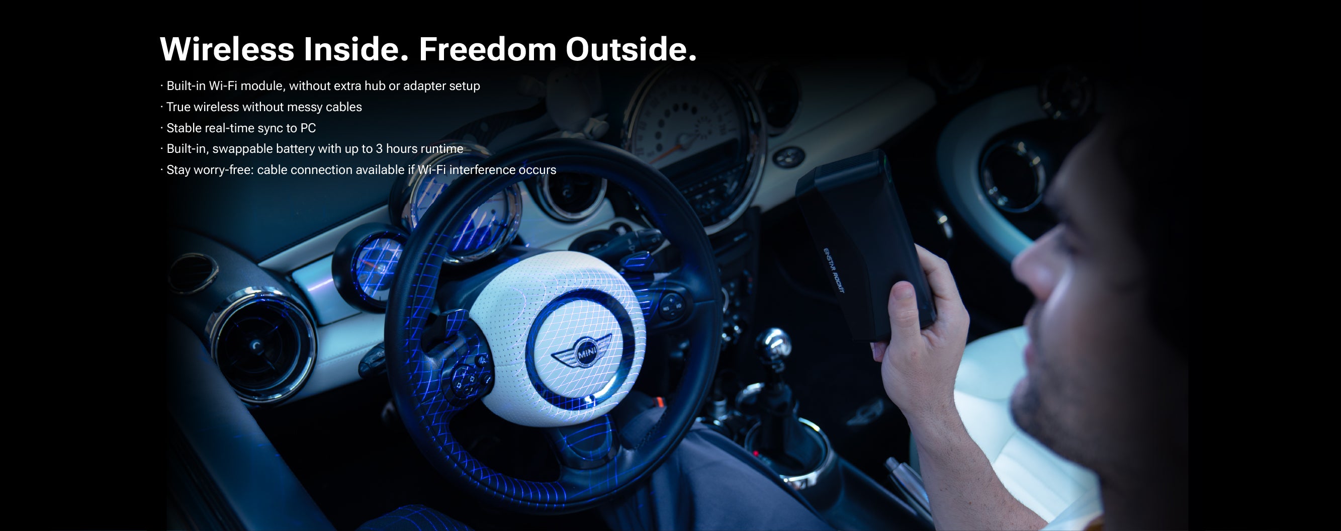 Yes, Rockit has a built-in Wi-Fi module for wireless connection to a PC doesn’t require any additional accessories, provide more convenient setup and stable connection. A USB Type-C cable connection is also available for stable operation in case of Wi-Fi interference.