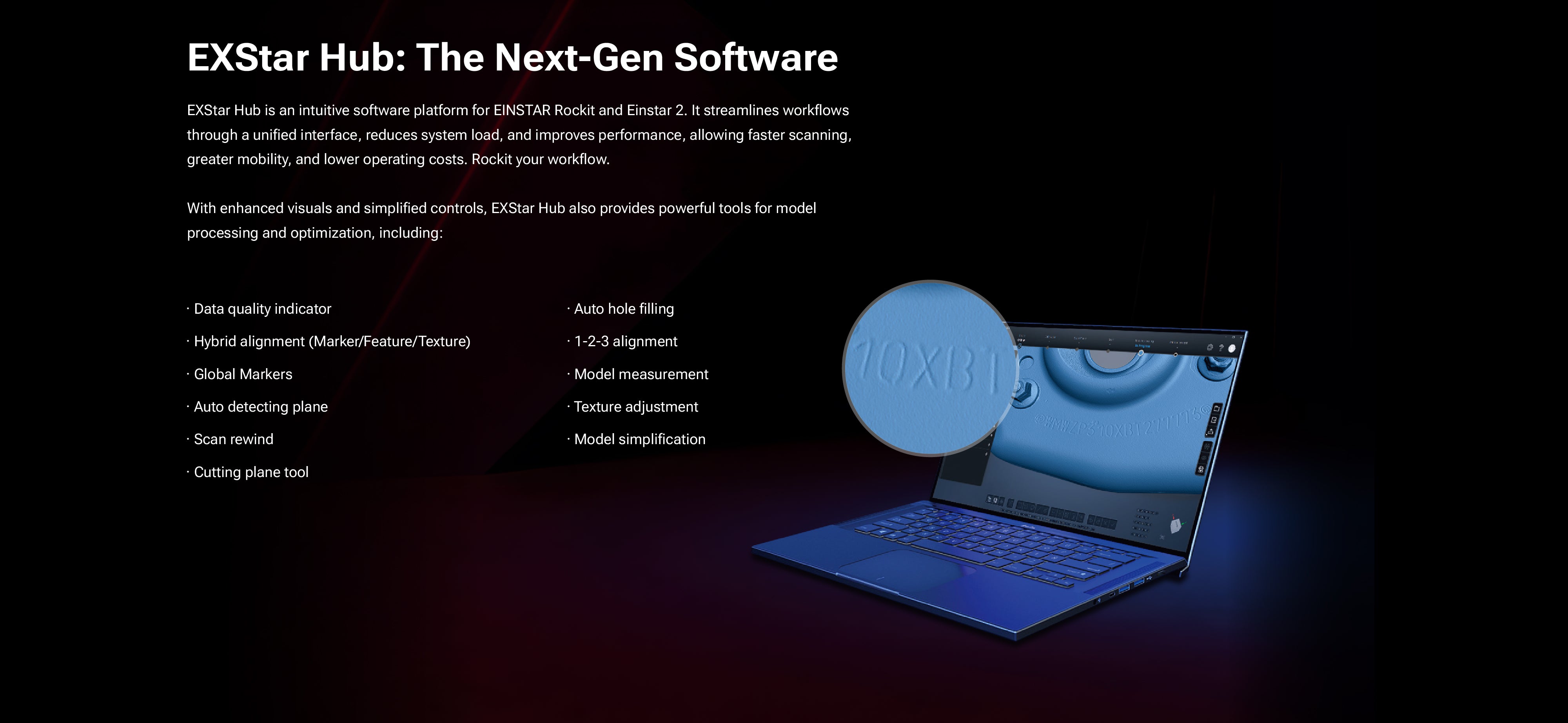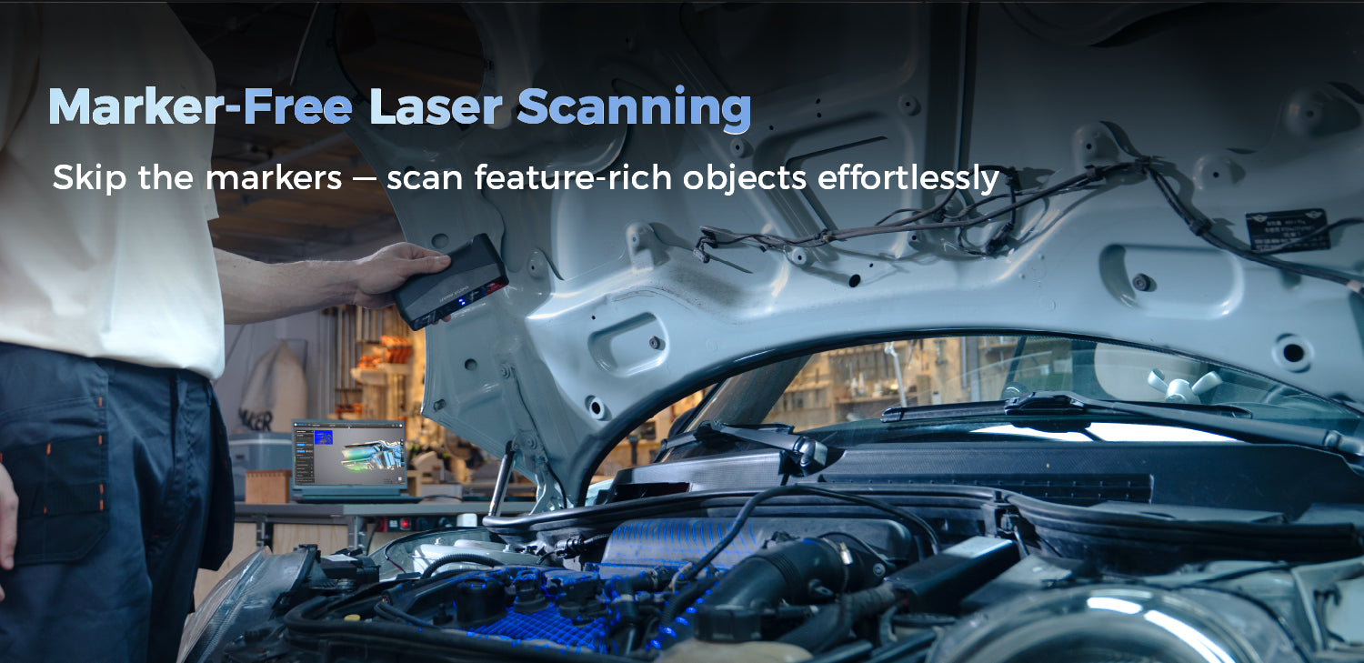 Rockit supports Marker-free laser scanning in both crossed and parallel lines, aligning data via feature recognition to simplify workflow and improve efficiency. It also supports marker-based alignment for objects with few surface features in laser mode. IR mode of Rockit support Hybrid align includes feature, texture and marker tracking for different objects.